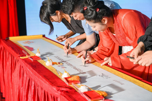 奥飞续华梦、文创谱新篇——当日下午3时许,奥飞文创中心品牌馆内座无虚席,颇具中华古风特色的揭牌签约仪式拉开了序幕。中新广州知识城开建办主任郑勇、黄埔区龙湖街道办书记姚锦全、黄埔区文广旅局局长陈文聪、黄埔区发改局局长杨元师、黄埔区区委宣传部二级调研员钟伟涛、广州市委宣传部文资办副处长叶政、奥飞硅谷董事长陈岱君、奥飞硅谷董事蔡熙敏、奥飞集团董事长特别助理詹庆光等相关领导及嘉宾,一同见证奥飞文创中心“广州市级文化产业示范园区”的揭牌。