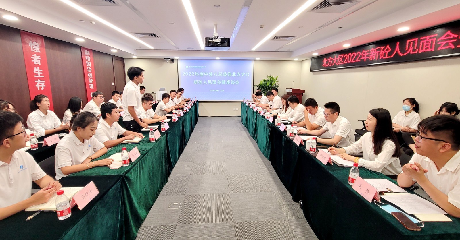 8月13日,中建八局装饰公司北方大区2022届新砼人见面会在京召开,八局装饰副总经理、北方大区管理中心主任王钦霖出席指导。大区管理中心代表,北京、海外及东北三家分公司领导班子、部门负责人代表共同出席本届见面会暨座谈会,会议由北京分公司总经济师王娜主持。