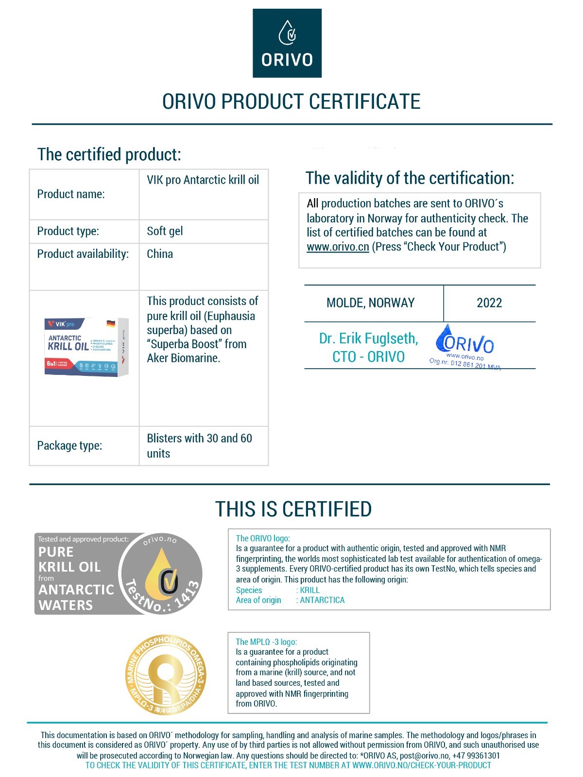 VIKpro南极磷虾油与全球顶级磷虾油原料供应集团挪威Aker公司达成战略合作,其所有产品生产原料均可以追溯至相应的捕捞海域。经过ORIVO认证中心的严苛检测,VIKpro强效56%纯南极磷虾油样品与市售产品品质如一,经ORIVO多项严苛检测,验证均为100%纯南极捕捞(磷虾)、100%纯南极磷虾油,且富含海洋磷脂等营养,因此荣获ORIVO的“100%纯南极磷虾油认证”和“海洋磷脂认证”。VIKpro南极磷虾油从挪威原产地、市场原料供应到样品追溯再到纯油成分四大环节皆获国际权威的一致认可。