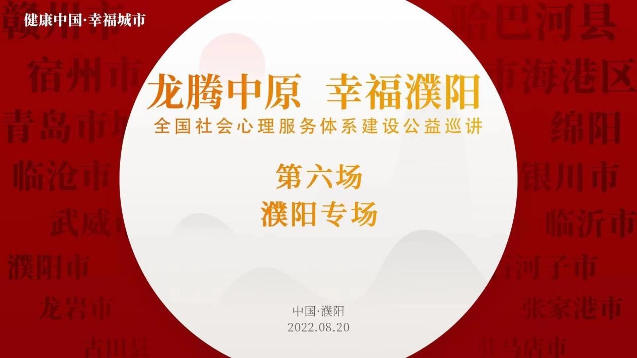 8月20日,“健康中国、幸福城市”全国社会心理服务体系建设公益巡讲活动第6场濮阳专场活动隆重举行。下一站公益巡讲活动将在宁德市古田县举行。