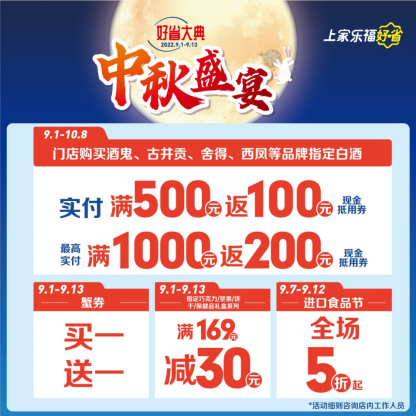 花好月圆,桃李满天下。即日期至9.12迎中秋谢师恩,家乐福好省大典、中秋盛宴已进入最后冲刺阶段,各项惠民活动丰富多样。买白酒送全场券、全球美食汇,精选进口零食5折、扫码免费领40元中秋红包(部分商品除外) 、优惠再叠加、放价进行中(详情以各门店活动为准)。同时叠加各地政府发放消费券活动,这个中秋来家乐福可谓是重重惊喜,月圆人欢。