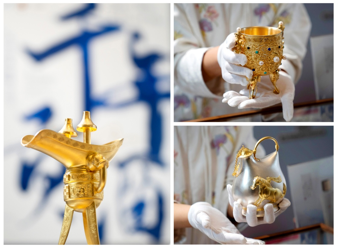 009展位上,颇具中国风的摆设,尤其是一组特殊的酒器吸引了所有人的目光,国际友人纷纷打卡拍照,“这是‘金瓯永固杯’、‘舞马衔杯酒壶’、‘爵’,都是中国历史上非常具有代表性的皇家酒器”品牌方说道,“复兴酃酒,就是复兴中国传统文化。009作为千年贡酒的传承者,希望为大家带来更丰富的品鉴感受,更全面的了解中国酒文化”。