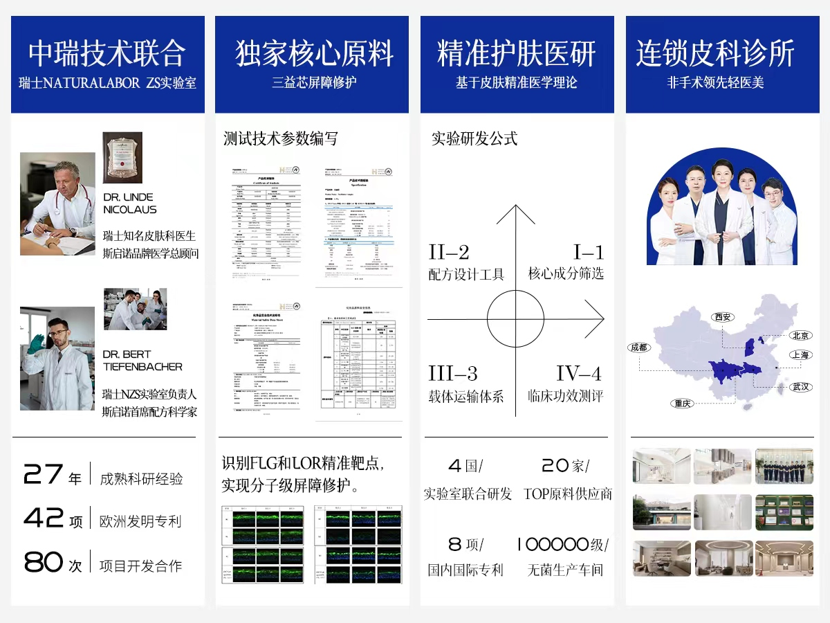 2022年6月斯启诺和瑞士Naturalabor ZS实验室共同建立技术联合实验室,着手独家功效原料Tri - Biotics Complex(三益芯)的研发。瑞士科研团队借助高通量筛选与靶点通路机制研究,经严格遵循相应分子机理,对源自欧洲深海(法国科西嘉岛Corsica深海昆布)、盐湖(土耳其图兹盐湖TuzGölü嗜盐菌)、火山口(意大利那不勒斯Solfatara火山嗜热菌)、高地(瑞士阿尔卑斯山Steingletscher火绒草)等极端天然环境的多种微生物及其代谢产物(益生元、益生菌和益生素)进行至优配比,并结合先进的包裹及延时释放技术,精准递送至皮肤表皮及深层,实现皮肤屏障系统的全面定向修护。