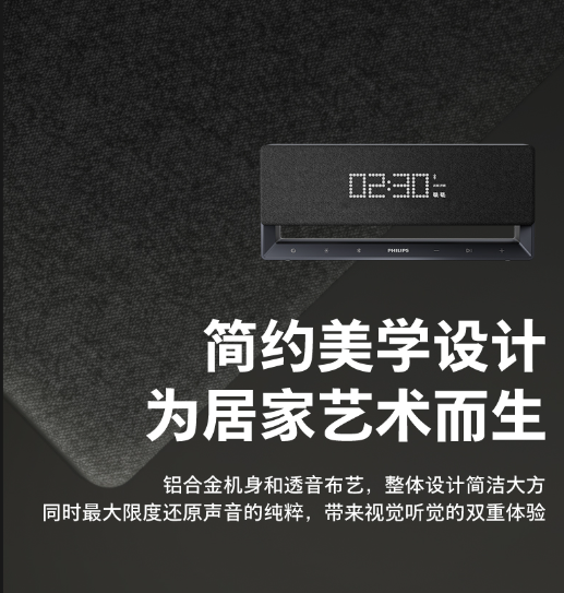 每每说到家居美学艺术,就会想到沉稳黑色、质感爆棚的重金属,但这些元素的过度出现,反而让家居变得沉闷,失去生活原有的生命力。而飞利浦S3908采用铝合金机身和透音布艺拼接设计,摆放在卧室或床头,既彰显品质又透露出轻松的生活气息。整体设计简洁大方同时还最大限度还原声音的纯粹,带来视觉听觉的双重体验,真正做到:简约美学设计为卧室居家艺术而生。