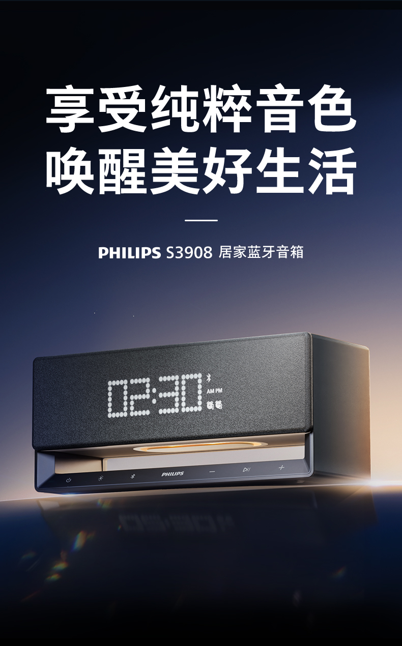 这一次,飞利浦影音便倾情呈现S3908时钟蓝牙音箱,再一次将设计美学和先进音频技术强效结合。以至于一上市,便成为高级白领人群、高级酒店时尚家居单品的不二之选,掀起一股与众不同的品质家居新潮。在每一个醒来的清晨或是疲惫的晚上,让这款实用美学产品贴心服务,用更纯粹的音色,唤醒美好生活。