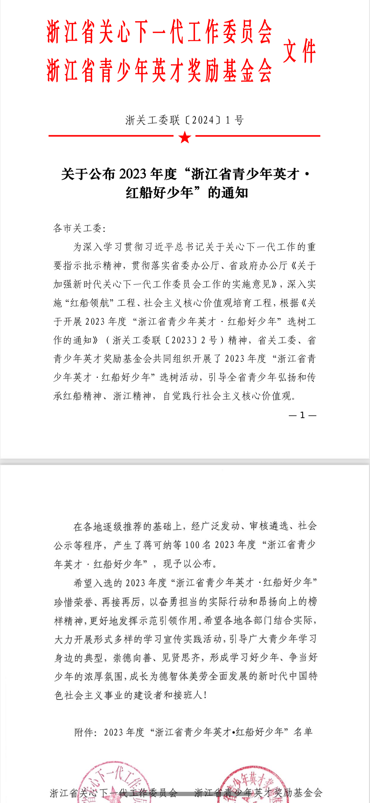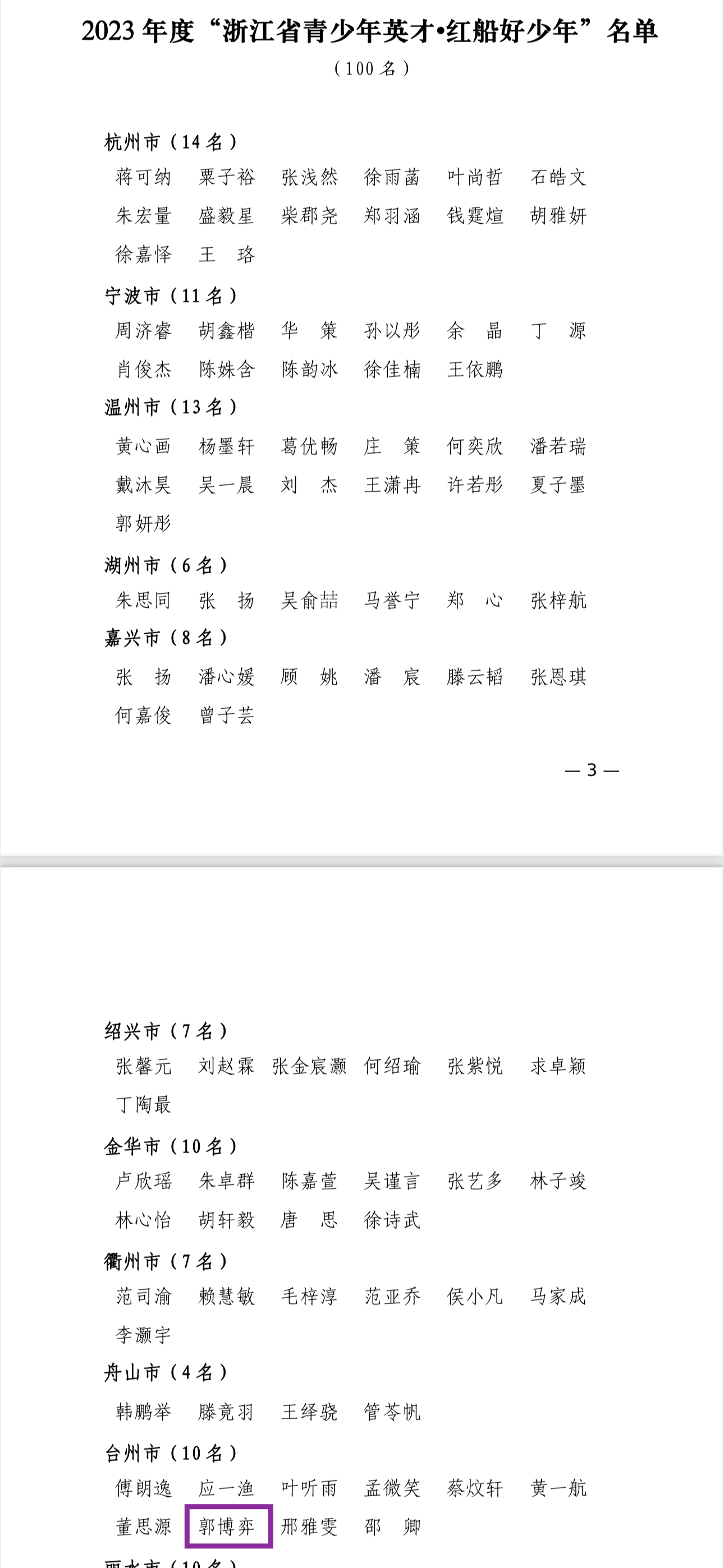 近日,2023年度“浙江省青少年英才·红船好少年”名单公布啦!在全省100位获评的红船好少年中,来自台州市温岭方城小学的童星郭博弈榜上有名! 童星郭博弈是位德智体美劳全面发展的小学生,热心公益活动和公益演出,他是中国共产主义少年先锋队浙江省第八次代表大会代表,他是浙江省新时代好少年候选人,是台州市和温岭市两级新时代好少年,他是温岭市首届创建全国文明城市形象大使,他是浙江少儿频道公益形象大使,他是新声有范形象代言人,他是网评2023年十大正能量艺人,他是2024年十大影响力童星。他参演了数十部影视剧,《大道地》、《小巷人家》、《吾凰在上》、《一个都不能少2023》、《哪吒重生之孽缘》等。他在他所参加的所有国内外顶级声乐大赛中都取得了核心荣誉,中国声乐国际大赛独唱特金奖、国际华人艺术节独唱金奖、中央音乐学院全国艺术展演独唱金奖、全国青少年艺术节独唱特金奖,等。 郭博弈参加的演出活动有数百场,今年年末的郭博弈尤其忙碌!他担任了由教育部指导,北大 清华 人大 中戏 中传 国音 北电 北舞等高校联合出品的“中国首部原创沉浸式儿童剧”《歌声改变人生》的全国推广宣传大使,短短一个月内,参加了在北京大学举行的全国新闻发布会独唱演出、在中国美术学院举行的浙江省新闻发布会独唱演出、在郑州大学举行的河南省新闻发布会独唱演出、在深圳青少年活动中心举行的广东省新闻发布会独唱演出。另外还参加了湖南2024新春喜乐会的独唱节目录制,以及浙江卫视.快手《一千零一夜晚会》“老铁联欢晚会”的录制,目前还在忙碌其他节目的准备!期待他带给大家更好的作品、更优秀的表现。 郭博弈除了艺术上的成就,他更关注公益性演出和活动,不辞辛劳地奔赴各类公益演出现场,个人也结对支助贫困山区小朋友,小小少年、大大能量!歌唱少年、公益同行,郭博弈用歌声和影响力感染他人、传递正能量,祝贺郭博弈在“浙江省青少年英才.红船好少年”榜上有名!