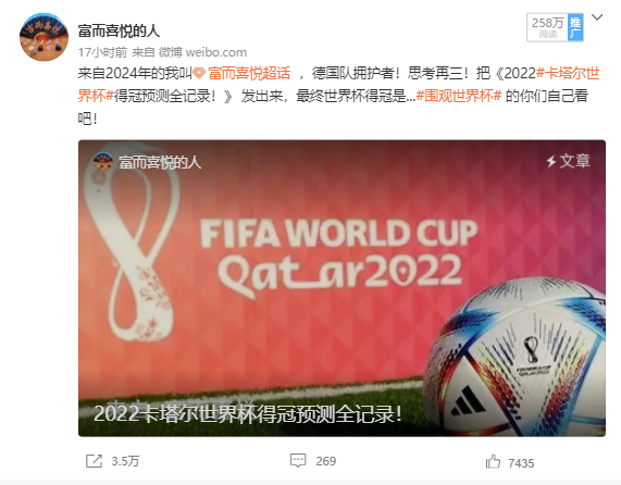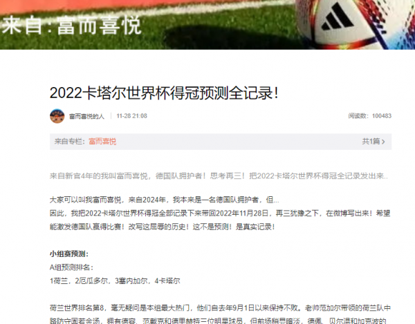这位新浪微博的博主富而喜悦,自己是德国队的拥护者,为什么还力挺巴西会是卡塔尔世界杯的冠军呢?只因在微博发布一篇“2022卡塔尔世界杯得冠预测全记录!”文章!一夜之间吸引250万微博网友各种力挺与吐槽不断走红网红!“世界杯神预测”头衔也让富而喜悦赚足了眼球!