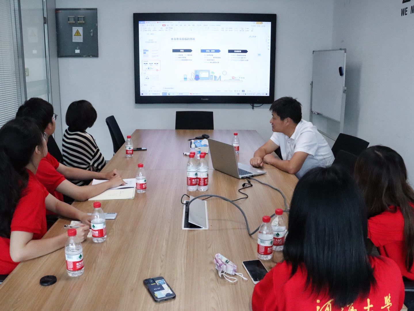 随后,实践团来到南京羚跃智能科技有限公司进行调研。实践团成员通过与周晓董事长的交流,了解了南京羚跃智能科技有限公司科技创新取得的成果以及公司未来发展的方向。周总表示,公司在智慧体育领域深耕多年,致力于为中小学体育教学提供新的解决方案,目前研发的“智慧运动场”产品已在市场取得不错的反响。紧接着,实践团成员在周晓董事长的带领下实地参观了南京羚跃智能科技有限公司的设备展厅,在听取工作人员的讲解、了解设备数据平台的整体架构后,实践团成员亲身体验了智慧体育设备。