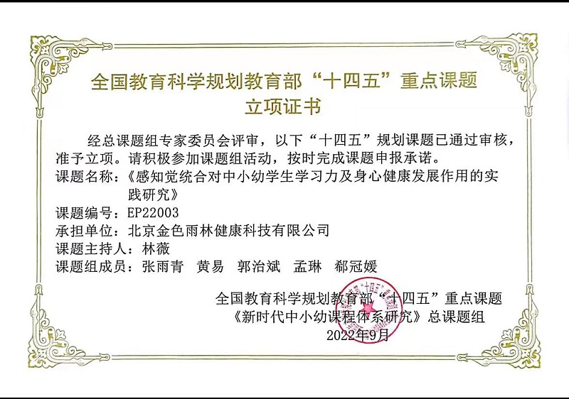 随着“十三五”课题的结题,金色雨林在此基础上再接再厉,奋楫笃行,再次承担全国教育科学“十四五”规划教育部部级重点课题项目的研究工作。由金色雨林董事长——林薇老师担任课题负责人的《感知觉统合对中小幼学生学习力及身心健康发展作用的实践研究》课题,于2022年10月入选教育部部级重点课题项目《新时代中小幼一体化职业启蒙教育课程体系构建研究》子课题并成功立项。