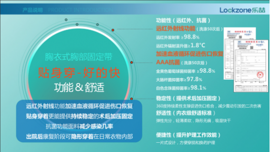 Lockzone乐喆是一家可穿戴式医疗科技公司,更是术后可穿戴式产品创新者,公司起源于心外科患者的临床需求,患者在做完开胸手术后或胸部骨折后,需要佩戴胸骨固定器,为了减轻疼痛、方便渡过排痰期、促进伤口恢复、预防伤口二次伤害的需求。通过23年临床经验的医学专家和16年贴身产品经验的设计师的跨学科合作,历时3年研发出这款内衣级舒适"胸部固定带"。