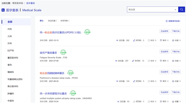 除了上述五个常用量表外,帕金森病常用的量表还有很多。例如《帕金森式病患者生活质量量表》、《统一多系统萎缩评测量表》等,这些量表在常笑医学网均有收录。常笑医学网作为一家专业的医学服务平台,量表工具 所收录的帕金森病常用、罕见量表种类齐全、内容权威且使用便捷,是精神科临床医生不可多得的在线量表工具。
