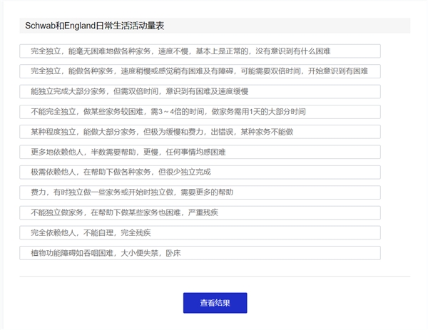 Schwab和England日常生活活动量表(Schwab and England Scale,SES)是Schwab和England于1969年修订,用于评价帕金森病人的日常生活活动能力。