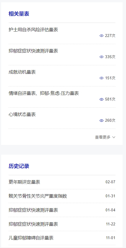 常笑医学网量表工具在评测页面右侧设置了相关量表与历史记录功能,可以迅速帮助医药工作者调取可能使用到的相关量表,多个量表组合使用更方便。