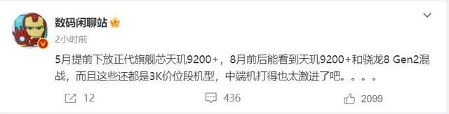 联发科天玑 9200 + 芯片在路上了。预计将是天玑 9200 芯片的超频增强版。据微博博主 @数码闲聊站 新料,5 月提前下放正代旗舰芯天玑 9200+(iQOO Neo8 年中产品提前到 5 月),8 月前后能看到天玑 9200+ 和骁龙 8 Gen 2 混战,并且聚焦 3K 价位段机型,中端机争斗激进。