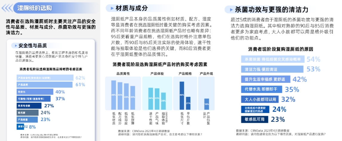 从湿厕纸消费人群分析来看,人们在选购湿厕纸时更关心湿厕纸产品本身的安全性与品质、材质和成分、杀菌功效和强清洁力,这些因素让他们在购买产品时更加谨慎。
