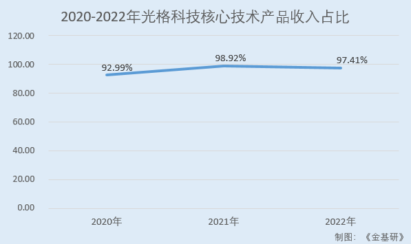 近年来,光格科技的核心技术在产品中得到广泛应用,产研深度融合。2020-2022年,光格科技核心技术的产品销售收入占比为92.99%、98.92%、97.41%。