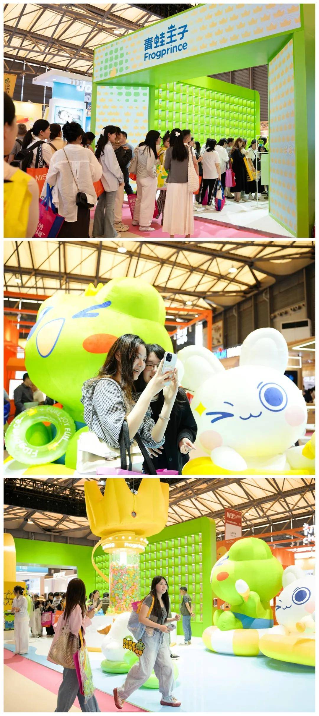 展馆内,青蛙王子以“天生玩家”为设计灵感,将游泳圈、浪花等具有夏日氛围感的元素融入空间,营造出充满童趣的夏日海滩氛围。展区中央的巨型装置“青蛙王子”、“萝卜妮”和“大嘎”更是成为全场焦点,吸引了众多观众的驻足打卡。同时,馆中特别设置的"人生四格"主题摄影自拍区,还搭配了限量版文创周边发放,形成线上线下传播热潮。