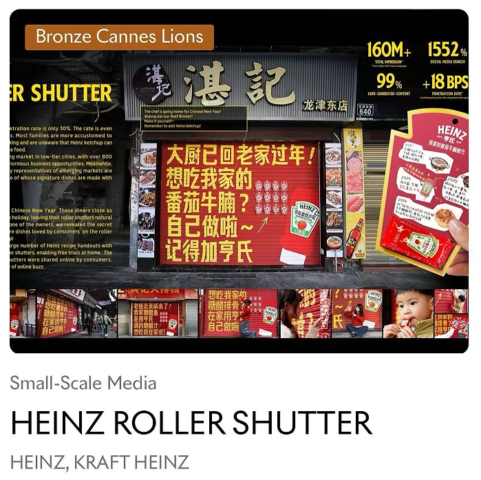 6月18日晚从戛纳发来消息,由赞意携手全球食品巨头亨氏打造的 “HEINZ ROLLER SHUTTER”(“亨氏卷帘门”)项目,在2025戛纳国际创意节上斩获媒介狮铜奖(“Small-Scale Media”类别)。这一荣誉代表了戛纳国际创意节评委对项目创意与媒介策略的高度认可。