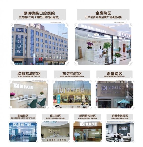 目前,德韩口腔在昆明各区设有 6 家分院,包括盘龙、五华、官渡、西山等多个主城区,形成了覆盖全市的口腔医疗服务网络。此外,在宝山、曲靖、昭通设有 4 家分院,服务范围辐射东南亚地区,形成跨区域诊疗网络。