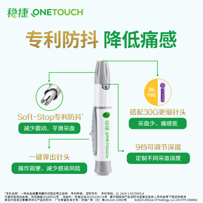 而真正的温柔,体现在每一次采血的细节里。强生稳捷智优血糖仪(低痛款)将“低痛”理念贯穿于采血全过程,仅需0.4微升的微量血液即可完成精准测量,这意味着更微小的创口和更快的愈合速度,痛感自然大幅减轻。为了确保穿刺过程稳准轻快,它还融入了Soft-Stop专利防抖技术,有效防止因手部轻微抖动导致的针头不稳或反复摩擦,实现“一击到位”;甚至可以提供多达9档的采血深度调节功能,无论糖友皮肤是娇嫩还是略厚,都能找到适合自己的那档,个性化定制低痛感采血方案。这一系列环环相扣的设计,目标直指尽可能地减少身体不适感,缓解测糖前的焦虑,让血糖监测不再是一件需要鼓起勇气才能完成的任务。