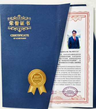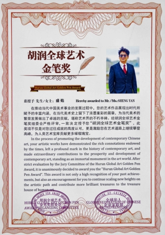 经胡润全球艺术金笔奖组委会严格评审,一致决定授予画家盛焰博士“胡润全球艺术金笔奖”。