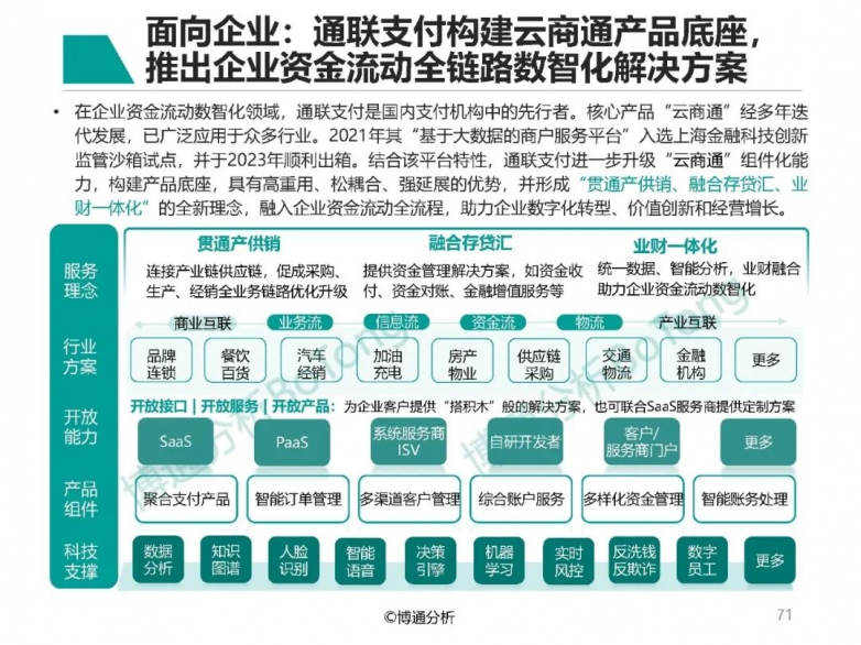 凭借在数字化服务领域的卓越表现,通联支付“云商通”成功入选博通分析发布的《非银支付行业年度专题分析2025》标杆案例。报告指出,通联支付通过融合支付、账户、科技等核心能力,深入产业链为商户、企业、金融机构等提供全方位的数字化服务,推动了行业从单一交易媒介向综合价值创造平台的升级。