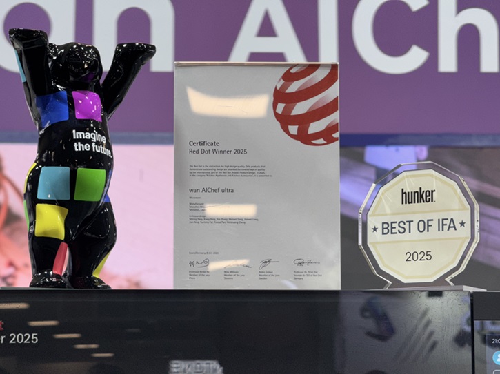 与此同时,万得厨在AI厨电方向的探索也收获了来自国际的高度肯定。其旗舰产品烹饪智能体 wan AIChef ultra 凭借独特的产品设计与智能交互体验,斩获享有盛誉的德国红点设计大奖。这一奖项不仅彰显了万得厨在产品设计与用户体验上的全球领先力,也进一步巩固了其在智能厨房赛道的优势位置。这些殊荣,不仅是对万得厨产品力与技术力的背书,更是对其全球化战略路径和生态愿景的有力印证。
