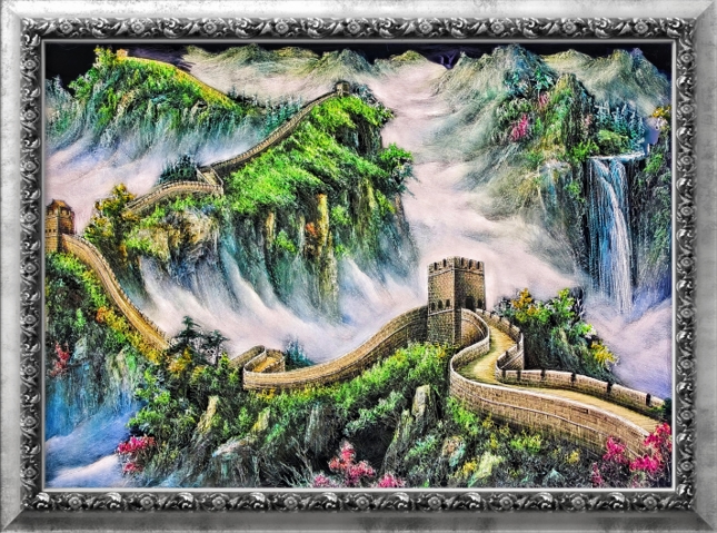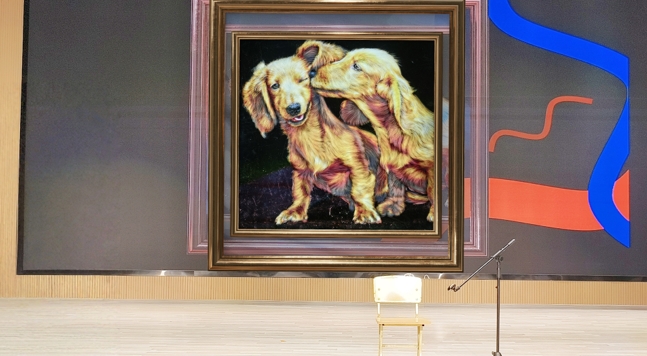 讲座现场,盛焰教授通过4K视频展示镜画作品的动态演变:背光源映照下,《长城》的山峦随光线明暗渐次“生长”,《老狮王》的鬃毛仿佛拂动,花鸟题材“活色生香”,人物形象“呼之欲出”。这种“虚实相生、横看成岭侧成峰”的视觉效果,源于传统“借景”美学与现代光学原理的碰撞——加上数字艺术设计和电脑技术融合,神奇表现静态到动态的镜画艺术。