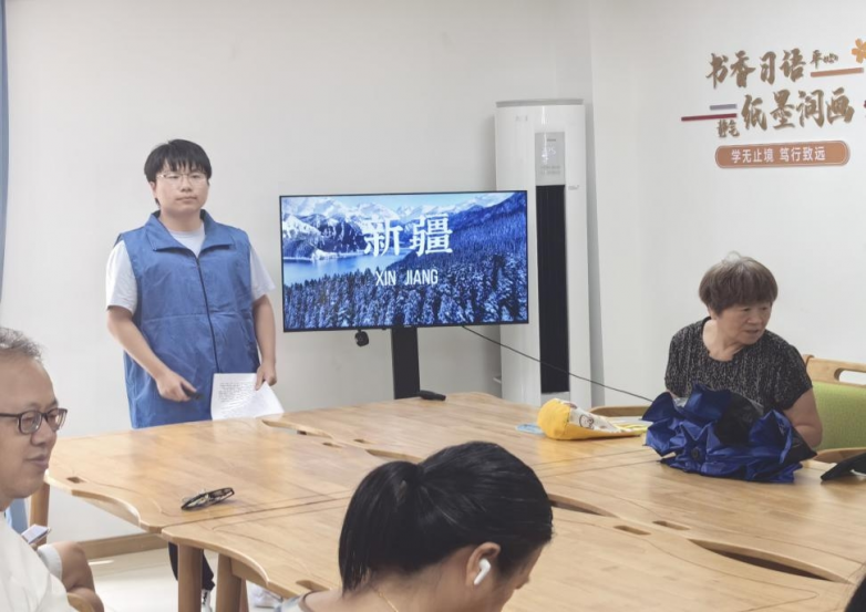 医学科普宣讲结束后,“挽民族星光,寻家乡特色”实践小分队接过接力棒,开启新疆文化宣传之旅。小分队成员以“走近大美新疆,共话多元文化”为主题,通过影像资料、实物展示和现场讲解,为社区居民带来沉浸式文化体验。团队成员通过一幅幅摄影作品和一段段纪实视频,带领居民“云游”新疆。从雪山草原到沙漠绿洲,从喀什老城到现代乌鲁木齐,辽阔多元的地域风貌和朴实浓厚的人文情怀深深吸引了在场每一个人。讲解员生动讲述多民族共生共荣的故事,尤其重点介绍了维吾尔族、哈萨克族等少数民族的传统习俗与文化传承,展现新疆作为多民族文化交汇之地的独特魅力。