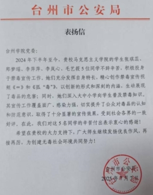 近日,台州学院马克思主义学院张琪蕊、郑梦瑶、李萍萍、李岚心、毛艺筱5位同学组成的“禁毒YOLO团”宣讲团,收到了来自台州市公安局的表扬信。信中对我校马克思主义学院同学们积极投身禁毒宣传工作、取得显著成效给予高度赞誉,并向学校表达了衷心感谢。