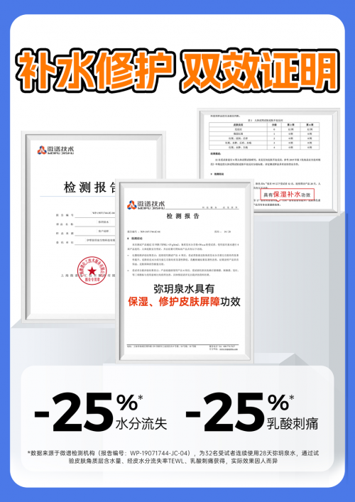 且根据第三方检测报告显示,该产品兼具补水、舒缓、修护力。天山冰川温泉水属于天然小分子团水,具备优异的吸收性和补水性,能够快速补水,舒缓肌肤干燥紧绷不适;水中还含有丰富的对皮肤有益的硫硒硅元素,能够增强皮肤屏障功能。