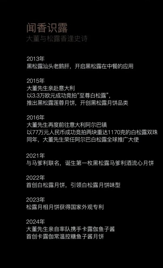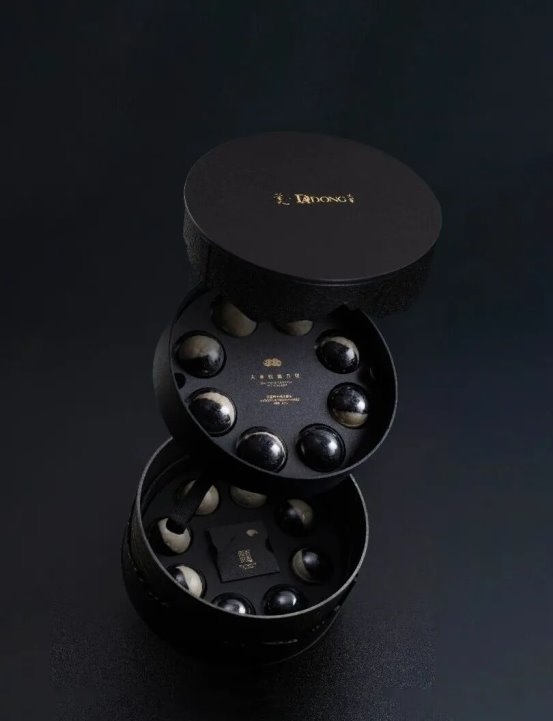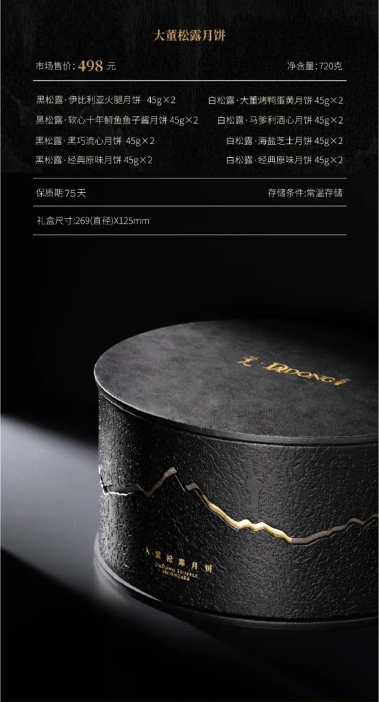 意大利黑白松露、伊比利亚火腿橡果黑猪火腿后腿、十年鲟鱼鱼子酱、北京烤鸭 、海盐芝士……东西合璧,厚重轻奢联袂,才是大董松露月饼,方能重塑中秋味觉想象。