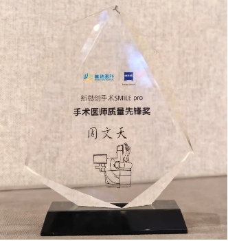 周文天教授荣获“新微创全飞秒TM手术SMILEpro手术质量先锋奖”。