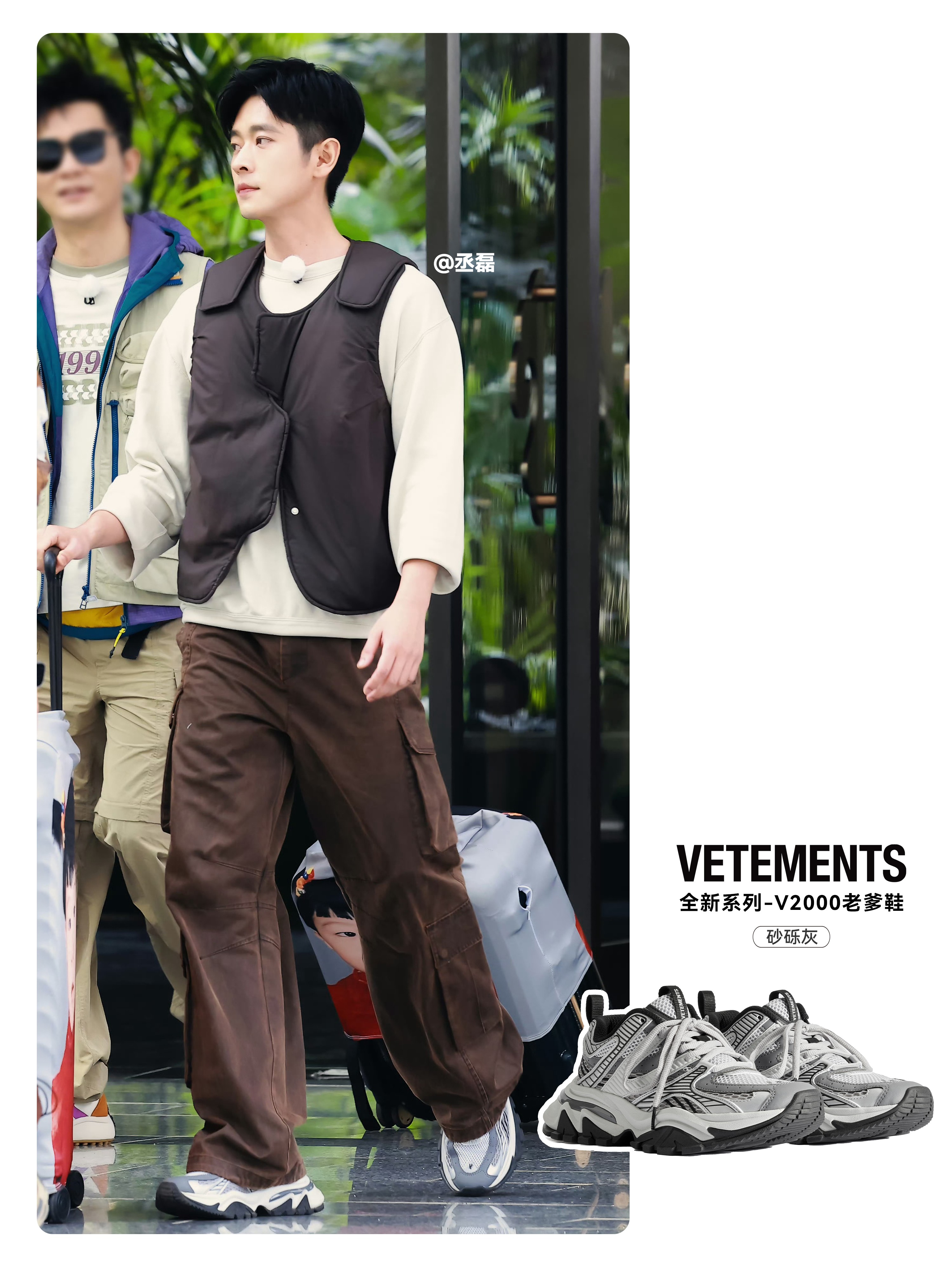 丞磊 在《奔跑吧兄弟》录制路透中全速冲刺,砂砾灰V2000老爹鞋踩出节奏感,复古做旧的色调与利落长腿形成视觉暴击。VETEMENTS V2000轻量中底支撑每一次即兴奔跑,潮流与功能性在此刻达成完美平衡。