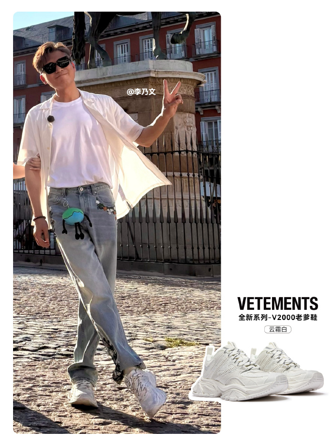 李乃文 出现在《地球超新鲜》的松弛旅程中,同是脚踩云霜白V2000老爹鞋,廓形大底一出,瞬间打破沉稳人设。干净配色+膨胀式轮廓,步履间少年感溢出屏幕。谁说成熟男星不能“踩高”出场?VETEMENTS用一双鞋,重新定义“轻盈态度”。