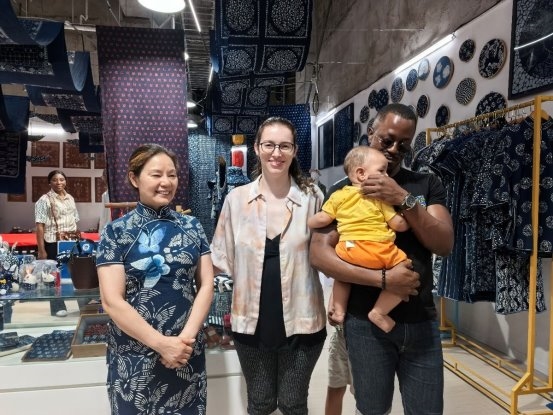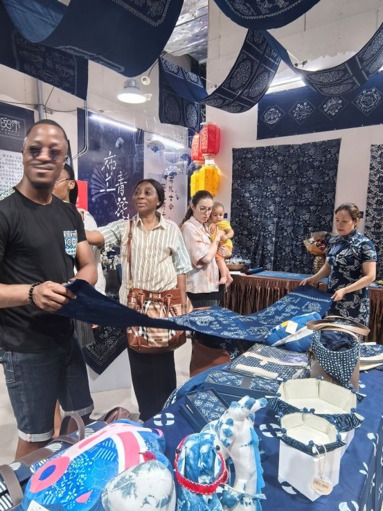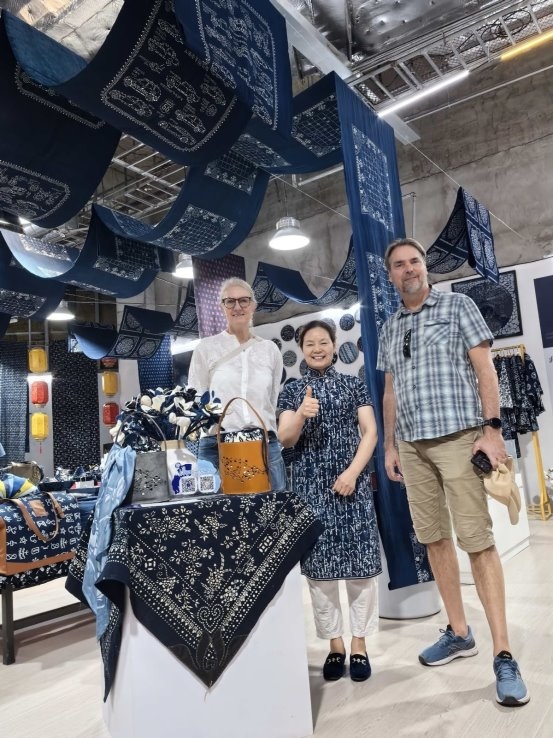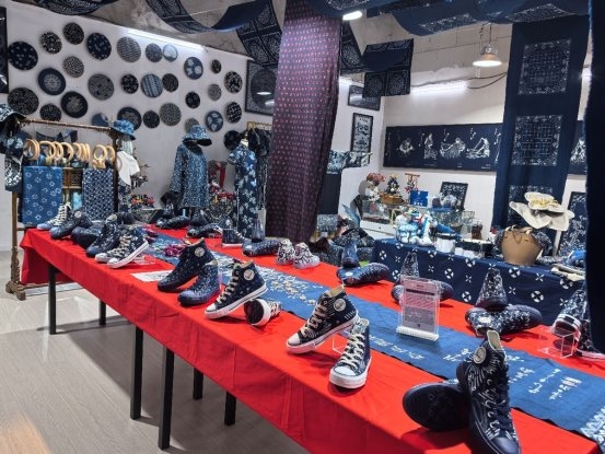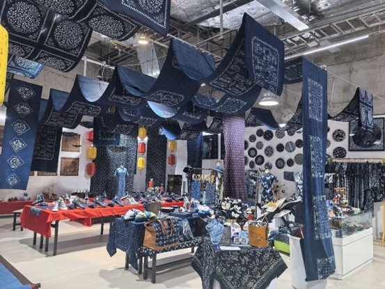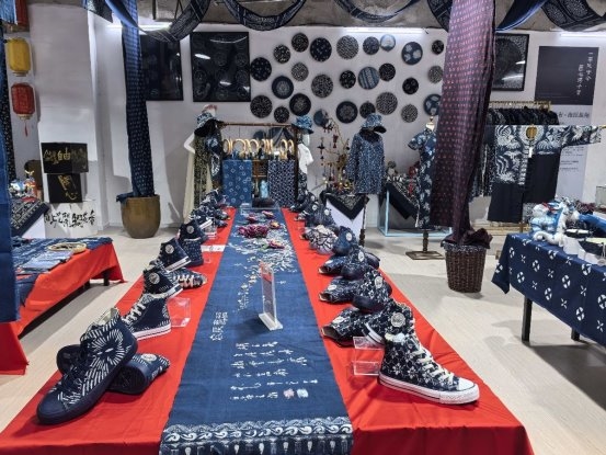 本次展览不仅是非遗技艺的展示平台,更体现了社会力量对传统文化传承的协同支持。新世界大丸百货作为高端商业空间,为非遗提供了面向公众的窗口;上海君韬文化创意发展有限公司创始人胡苏芬作为药斑布印染技艺代表性传承人,拥有同济大学和德国曼海姆大学双硕士学位,其国际化视野与专业背景为非遗传承注入了创新活力。她带领团队持续通过“以皮养布”、“跨界融合”等模式推动非遗活化;而“药斑布非遗鞋子”项目与上海百年著名品牌回力联名的产品展示,进一步凸显药斑布创新性传承和创造性转化,也为传统工艺与现代商业的结合提供了新思路。