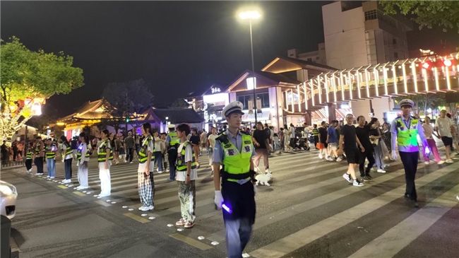 县学街与上下街交汇的十字路口,是连接衢州古城景区两大核心历史街区的“咽喉要道”,假期里每天傍晚六点至九点,正值车流与人流交织的高峰时段,两排身着统一服装的“三衢义警”格外引人注目。这群来自衢州学院的学生志愿者,他们整齐分列在斑马线两侧:绿灯亮起时细心守护行人,红灯亮起时保障车辆畅行,让繁忙路口的交通始终井然有序。