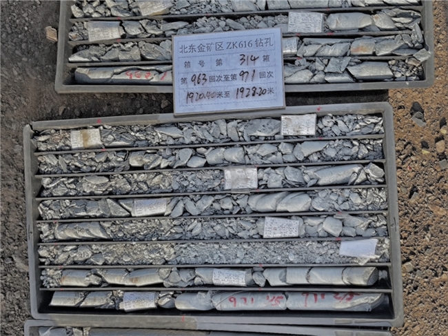 在北东和460矿区超深孔发现多层矿化体,深部找矿取得重大突破。其中,超深孔ZK616钻孔的施工进尺达2002.4米,自上而下全孔共发现5层矿化体。第一层在374.2米处见矿,厚度1.05米,金品位为5.42g/t;第二层在556.6米处见矿,厚度1.26米,金品位为1.74g/t;第三层在868.4米处见矿,厚度2.35米,金品位为11.520g/t;第四层1463米见矿,厚度1.44米,金品位4.02g/t;第五层在1920.4米见矿,厚度4.38米,品位6.84g/t。