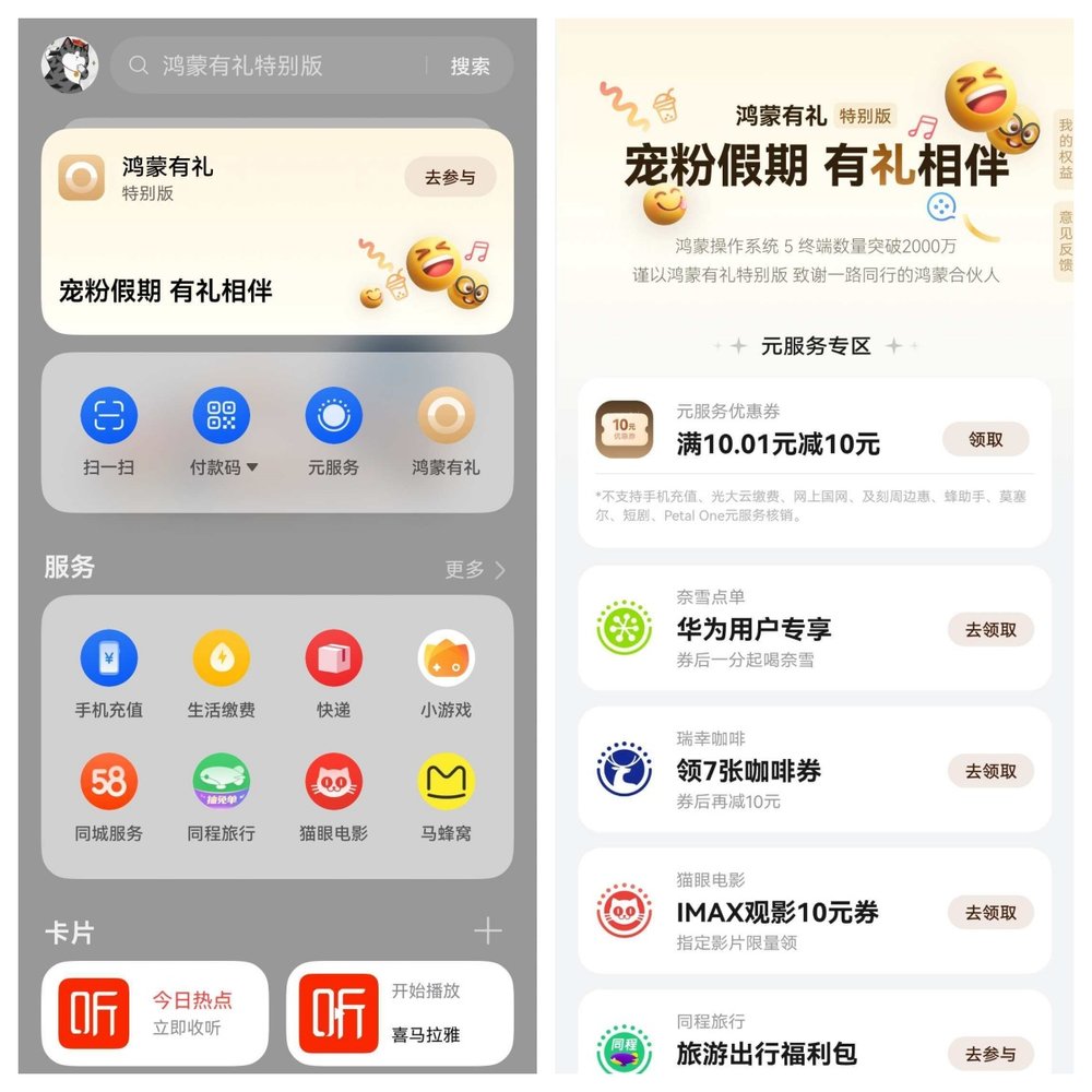 如果你和我一样正在返工的路上,无论是想给爱车加油,还是点杯咖啡提神,都不妨在手机桌面右滑进入负一屏,进入“鸿蒙有礼特别版”活动中,抓住最后的机会,为这个完美的假期画上一个省钱又省心的句号!