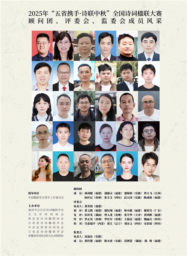 近日,由福建省楹联学会青年工作委员会副主任、台江区诗词楹联学会副会长兼秘书长黄奕铭组织牵头,并以福建省楹联学会青年工作委员会名义,特邀中国楹联学会青年工作委员会指导,联合无为市诗词协会、贵定县诗词楹联协会等六家跨五省县级诗词楹联组织共同主办,台江区诗词楹联学会创作专业委员会承办,诗词云、福建福筑万家文化传媒有限公司作为技术服务支持单位的全国性中秋主题诗词楹联大赛,在福州台江圆满收官。这场贯穿中秋的文化盛会,以诗为媒、以联寄情,汇聚两岸多地创作力量,彰显了中华优秀传统文化的强大生命力,更凸显了福建青年诗词楹联文化在全国诗词楹联领域的标杆及引领地位。