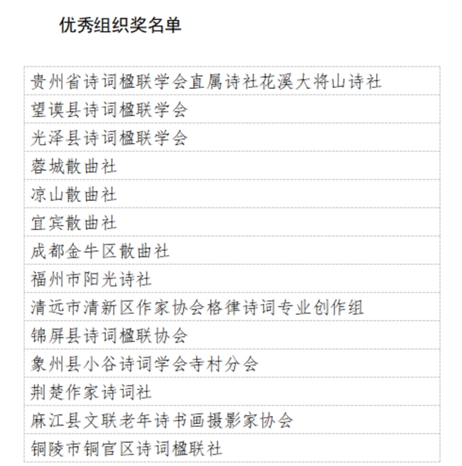 经专业评审,贵州省诗词楹联学会直属诗社花溪大将山诗社、福建省光泽县诗词楹联学会、福州市阳光诗社等14家单位荣获优秀组织奖。这些单位扎根县域乡村、深耕文化普及,充分展现了诗词楹联文化“深入人民群众、服务普罗大众”的生动实践。