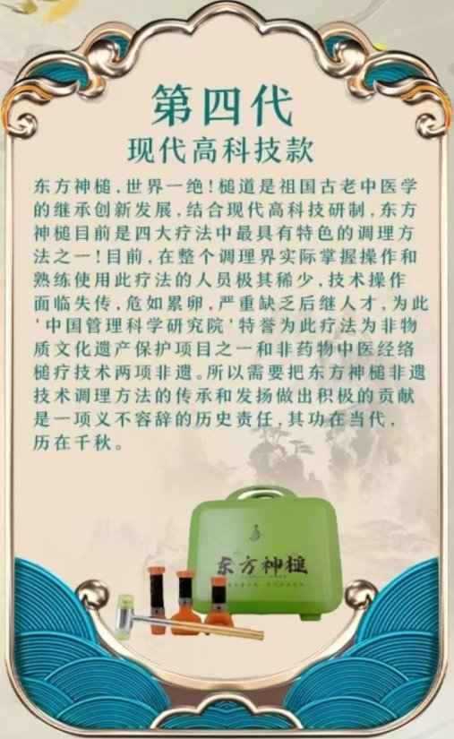 槌道古法技艺是对祖国古老中医学的继承、创新和发展,是一种舒适安全的新型物理疗法。东方神槌是槌道古法技艺的品牌化名称,通过特制槌具(如槌头、槌凿)敲击经络、穴位或肌肉筋膜,利用振动渗透,活化神经与肌肉组织,达到正骨、通络、激发自愈的效果。以《黄帝内经》、《易筋经》为理论基础,结合现代解剖学“以槌代手”的物理疗法,强调“不打针、不吃药、无创伤”的舒适调理,尤其擅长深层组织调理,安全性高,渗透力强,获国家实用新型发明专利,对风湿骨病、体态矫正、产后康复及各类痛症有显著效果,被称为“幸福疗法”。