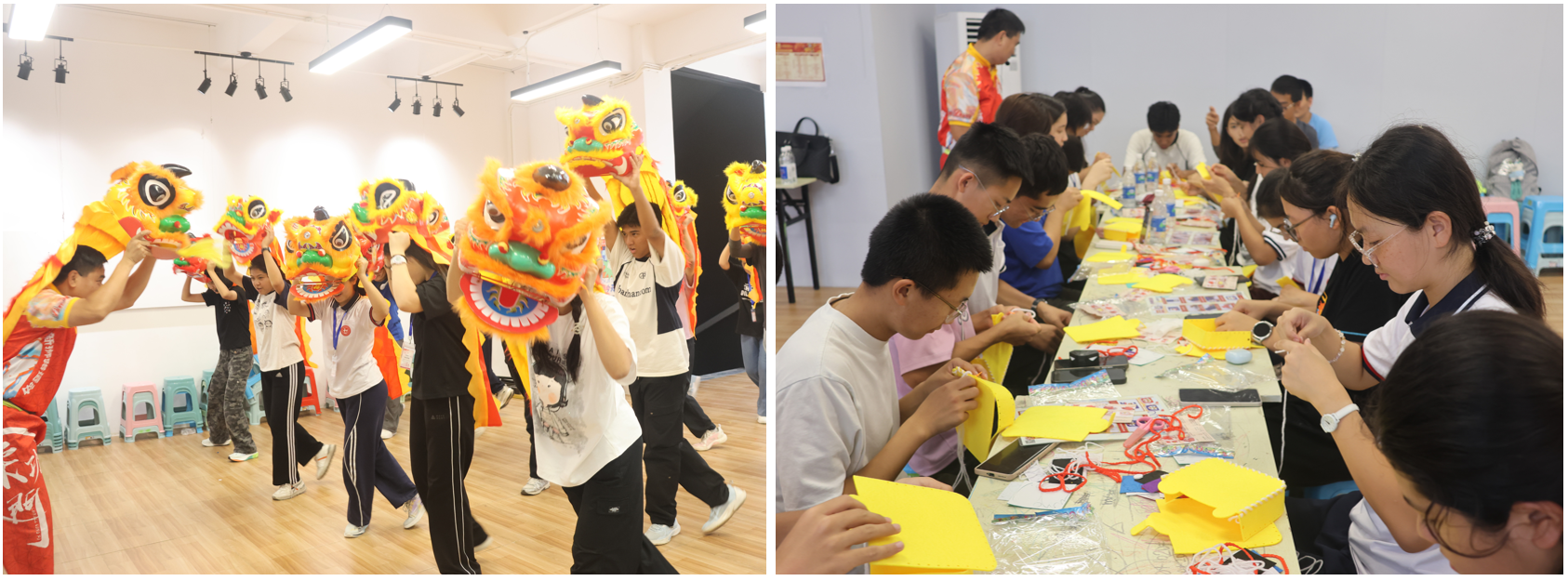 本次研学活动的一大亮点在第六天于岭南印象园上演。作为“龙狮会”主题的升华,同学们在这里进行了一场深度舞龙舞狮文化体验。在专业教练的指导下,从学习基本步法、握杆姿势,到感受鼓点节奏、学习龙狮神态,同学们分工协作,亲身体验了这项国家级非物质文化遗产的魅力。一条彩龙在同学们的齐心舞动下翻腾起舞,一头醒狮也随之灵动欢跃。这次体验让同学们实现了从“旁观者”到“参与者”的深刻转变,让同学们在岭南最具代表性的民俗活动中,感受到了中华优秀传统文化的生命力与凝聚力。