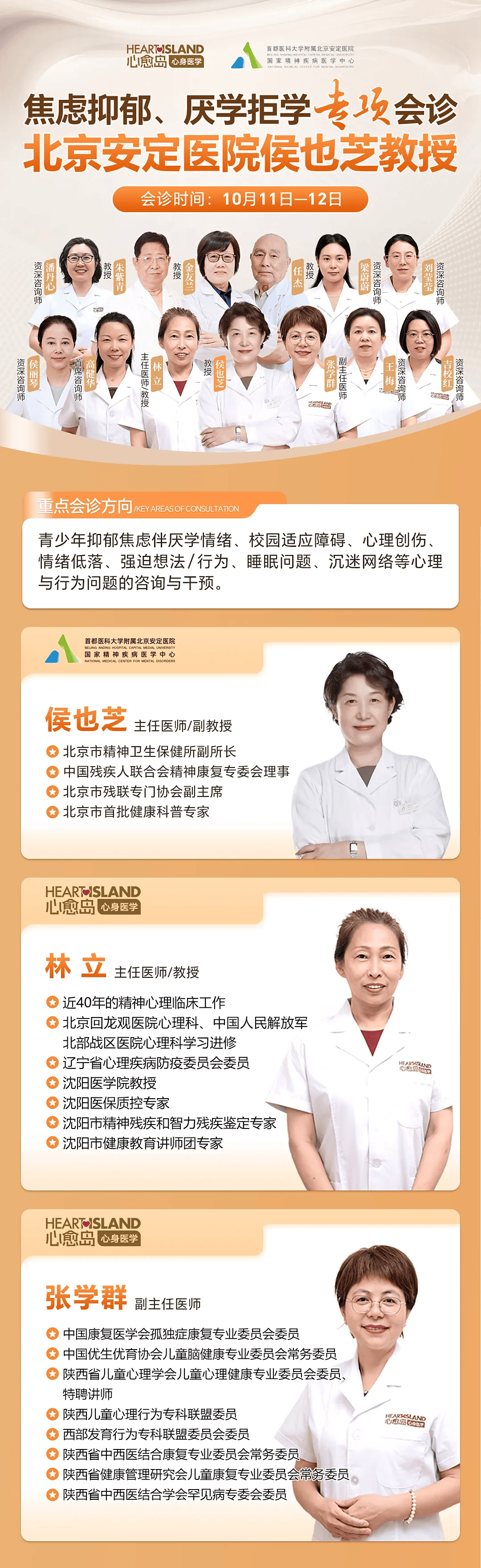 双节假期结束,但预约咨询需求热度不减!错过双节会诊的家长也不要着急,2025年世界精神卫生日来临之际,10月11日-12日,杭州心愈岛心身医学中心特邀北京安定医院知名专家侯也芝教授领衔多学科团队,开展专项会诊,直击青少年厌学拒学背后的深层心理因素,帮助家庭理清问题根源,制定个性化疗愈计划。预约通道已全面开启,请大家务必提前预约!