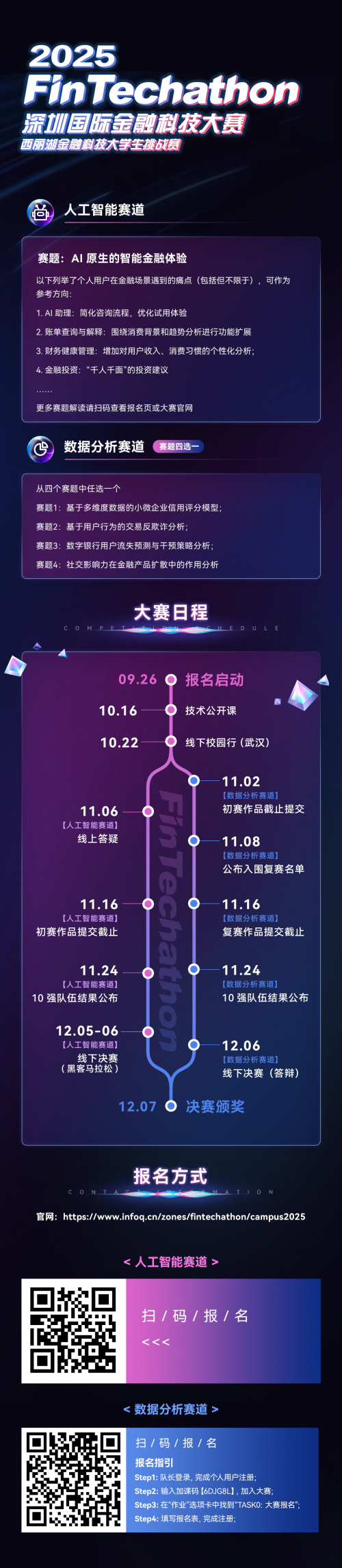 为了满足金融科技产业技术创新及人才需求,更好地推动金融科技产业发展,由深圳市地方金融管理局战略指导,深大微众金融科技学院、微众银行、InfoQ 极客传媒、狗熊会等多方联合举办的“2025 深圳国际金融科技大赛(FinTechathon)——西丽湖金融科技大学生挑战赛”(下文称“大赛”)于 9月 26日正式开赛。