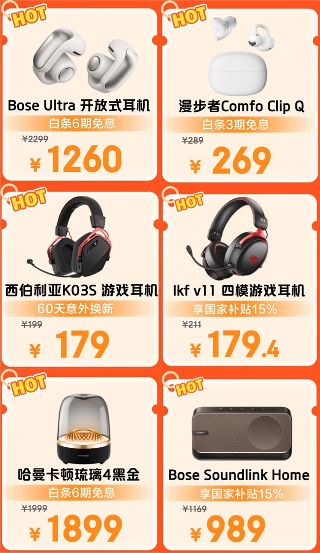 此外,活动还汇聚了多款满足专业场景与个性需求的音频设备。Bose Ultra开放式耳机以空气感佩戴与开阔声场见长,轻松应对长时间办公与户外活动;漫步者Comfo Clip Q采用耳夹式结构与亲肤材质,确保运动与通勤中的稳固舒适,两款皆支持分期免息。游戏玩家可关注专为竞技调校的西伯利亚K03S游戏耳机,凭借专为竞技优化的音频系统与高清晰麦克风,助你听声辨位、制胜全局;IKF v11四模游戏耳机则具备多平台无缝切换能力,购机还享国家补贴15%。居家聆听时,哈曼卡顿琉璃4黑金版以标志性水波纹光效与澎湃低音,成为桌面光影艺术与听觉享受的融合之作;Bose SoundLink Home则以饱满均衡的声学表现,为居家空间营造沉浸式聆听氛围。
