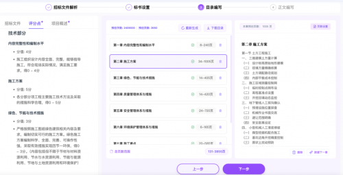 只需四步:上传招标文件解析——>完成标书设置——>生成目录——>生成正文,就能得到一份超大页数,满足暗标需求的技术方案文件。