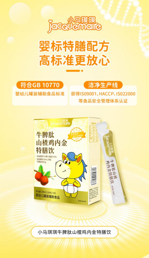 脆弱脾胃更需要长期养护,针对脾胃虚弱,小马琪琪牛脾肽山楂鸡内金特膳饮新品上市,婴标特膳配方,一袋添加600mg牛脾肽,强健脾胃强化免疫,添加8重药食同源好食材3,养出宝宝好胃口。≥45果汁含量,酸甜口感宝宝爱喝,0添加纯净配方,安全天然草本,不好的都没有。长期养护娇嫩脾胃,助力宝宝吃饭香香身体棒棒!