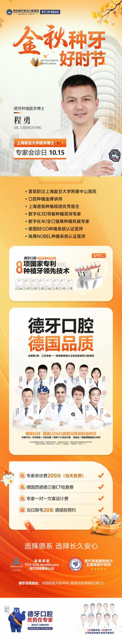 为了促进医疗资源下沉,让更多人家门口就能看到北上广三甲专家,10月15日,我院特邀上海复旦种植博士程勇亲诊,针对骨量不足、全口缺牙、疑难种植失败等复杂病例,提供一对一定制诊疗服务,解决您的各种烦恼与顾虑,安心、放心种好牙!