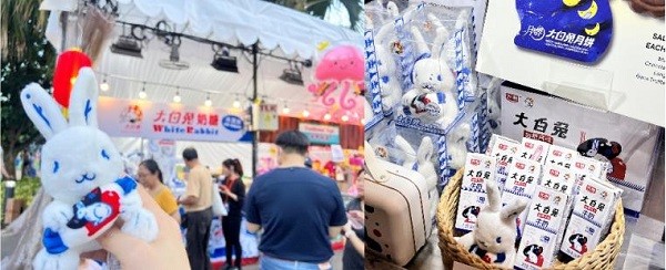 大白兔摊位则是本次出海的另一大亮点,除经典奶糖外,抱枕、咖啡杯、帆布袋以及新推出的毛绒挂件等衍生品集中亮相,迅速引发当地消费者的喜爱与购买。大白兔不只是一颗糖,更多产品的推出正标志着大白兔从食品向生活方式的跨界升级,通过场景化体验来深化与消费者的情感联结。